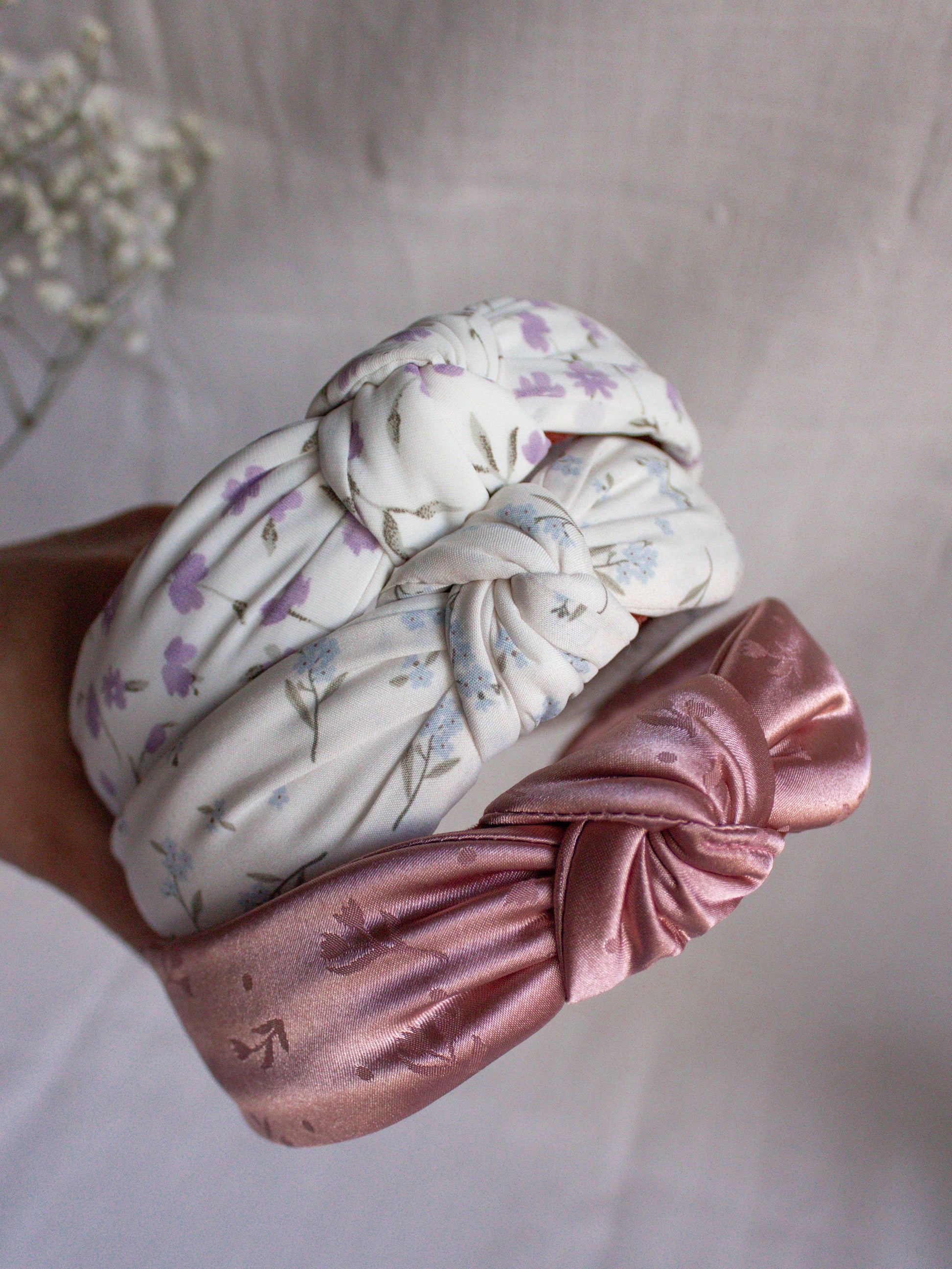 The Ballerina Tulip Top Knot is a handmade headband featuring a stunning arrangement of muted tulips on a luxurious, silky background. The use of premium fabric ensures superior comfort and durability, making this fashionable accessory a reliable day to day choice.